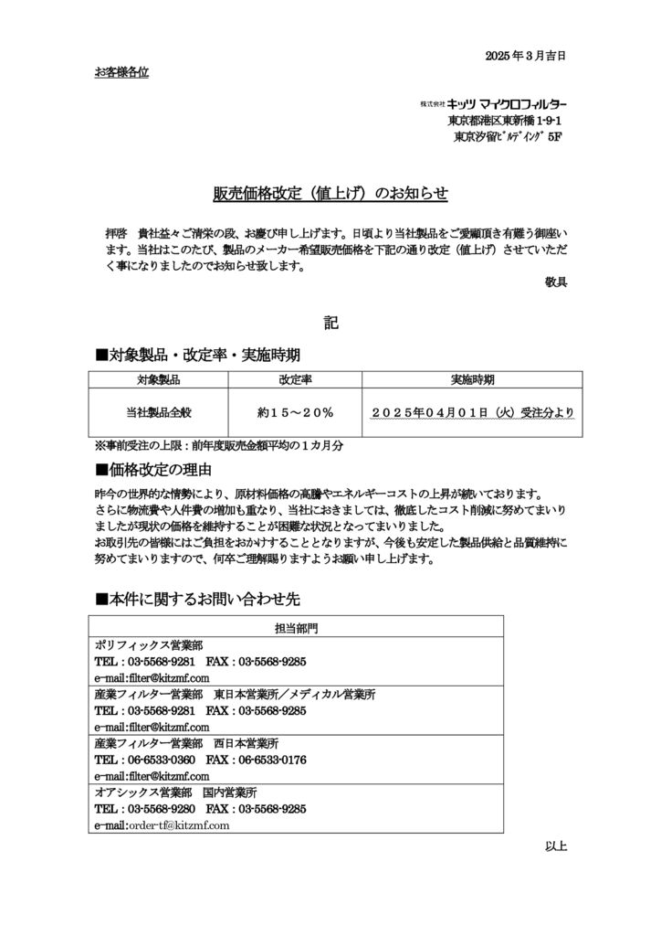 株式会社キッツマイクロフィルターは、2025年4月1日受注分より製品の価格改定をする事としました。