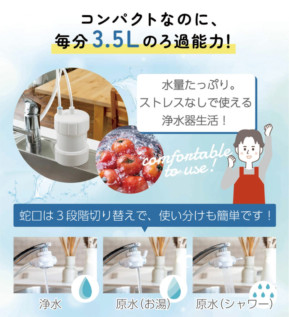 毎分のろ過流量は3.5リットル(水道圧0.1MPa)の大流量で、毎日の水道利用にストレスを感じることなくお使い頂けます。