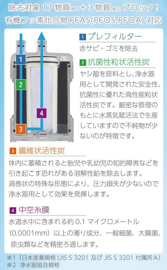 JIS規格で定められた全物質17項目除去、かつ、浄水器協会規格基準の3物質(PFOS/PFOA、鉄、アルミニウム)も除去する、細菌除去率99.999%の高性能浄水器です。