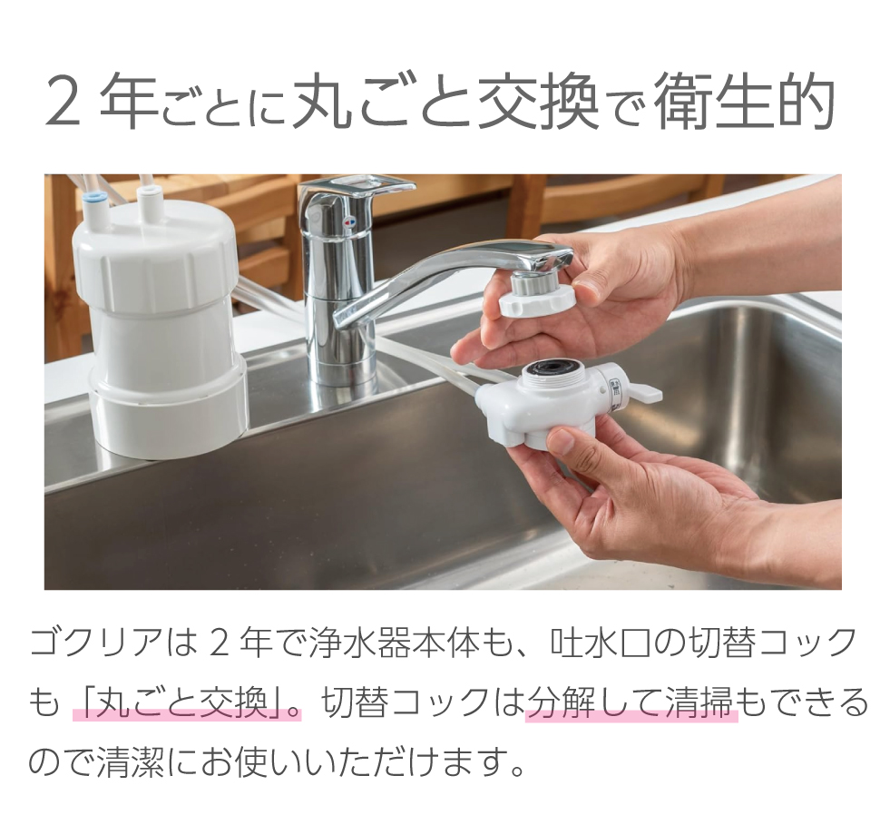 「カートリッジ+切替コック」を丸ごと取り替えるタイプなので清潔に使い続けることができます!