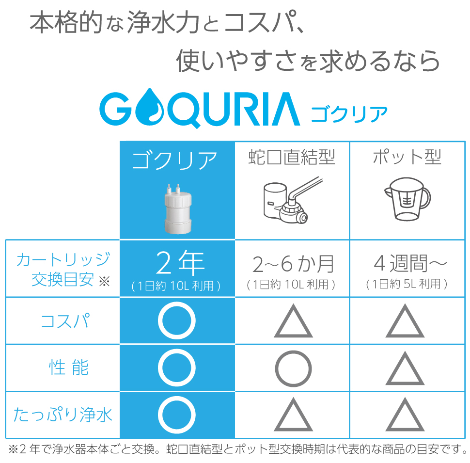 除去物質の除去率80%表記は品質表示法で定められた表記方法です。いずれのメーカーも品質表示法に従った表記をしている場合には除去率80%と記載されます。 浄水器は使用開始後から徐々に性能が劣化します。80%とは浄水器が寿命を迎えた段階(GOQURIAの場合は2年後)でも80%以上のろ過能力を有しているという意味となりますため、常に80%しか除去できないという意味ではございません。