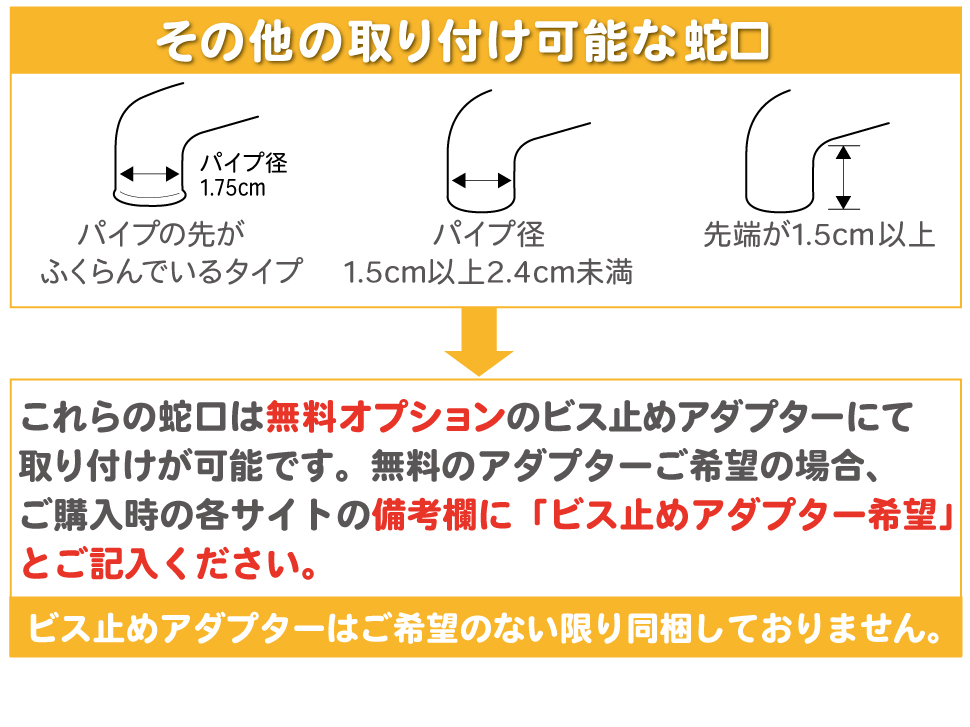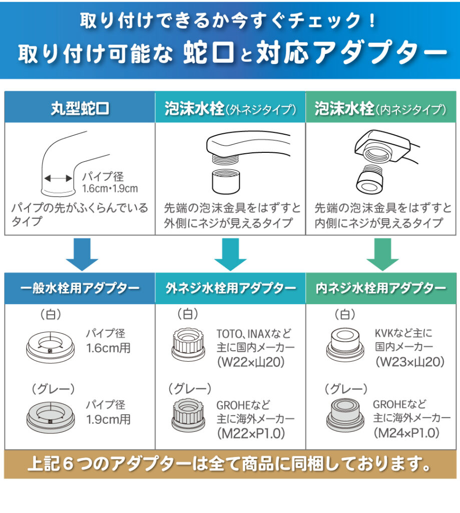 取り付け可能な水栓と対応アダプター